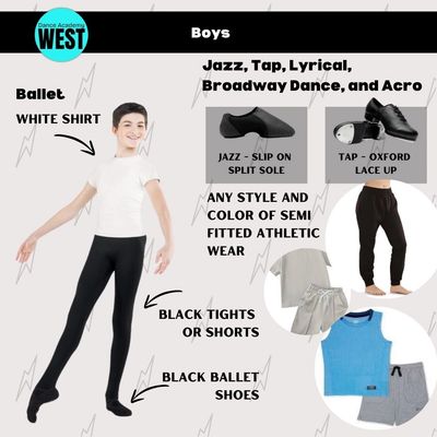 Boys should wear a sleeveless or short sleeve shirt that allows for movement. Boys may also want to consider a dance belt under tights, fitted pants, and shorts.